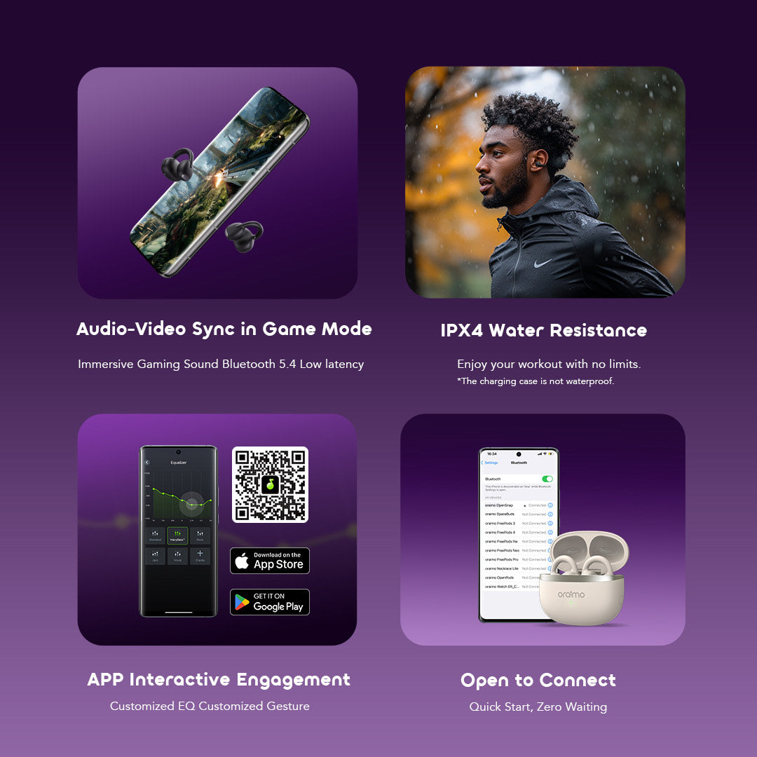 Durable and versatile, OpenSnap is IPX4 water-resistant, ready for workouts and outdoor use. With precise button controls, low-latency game mode, and customization through the oraimo Sound App, it combines premium performance with everyday convenience.